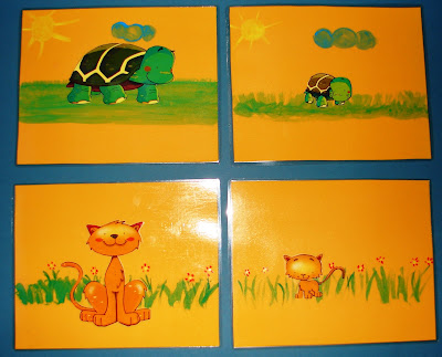 As imagens dos animais são da Revista "Educadores de Infância" e o fundo dos cartões foi pintado à mão.